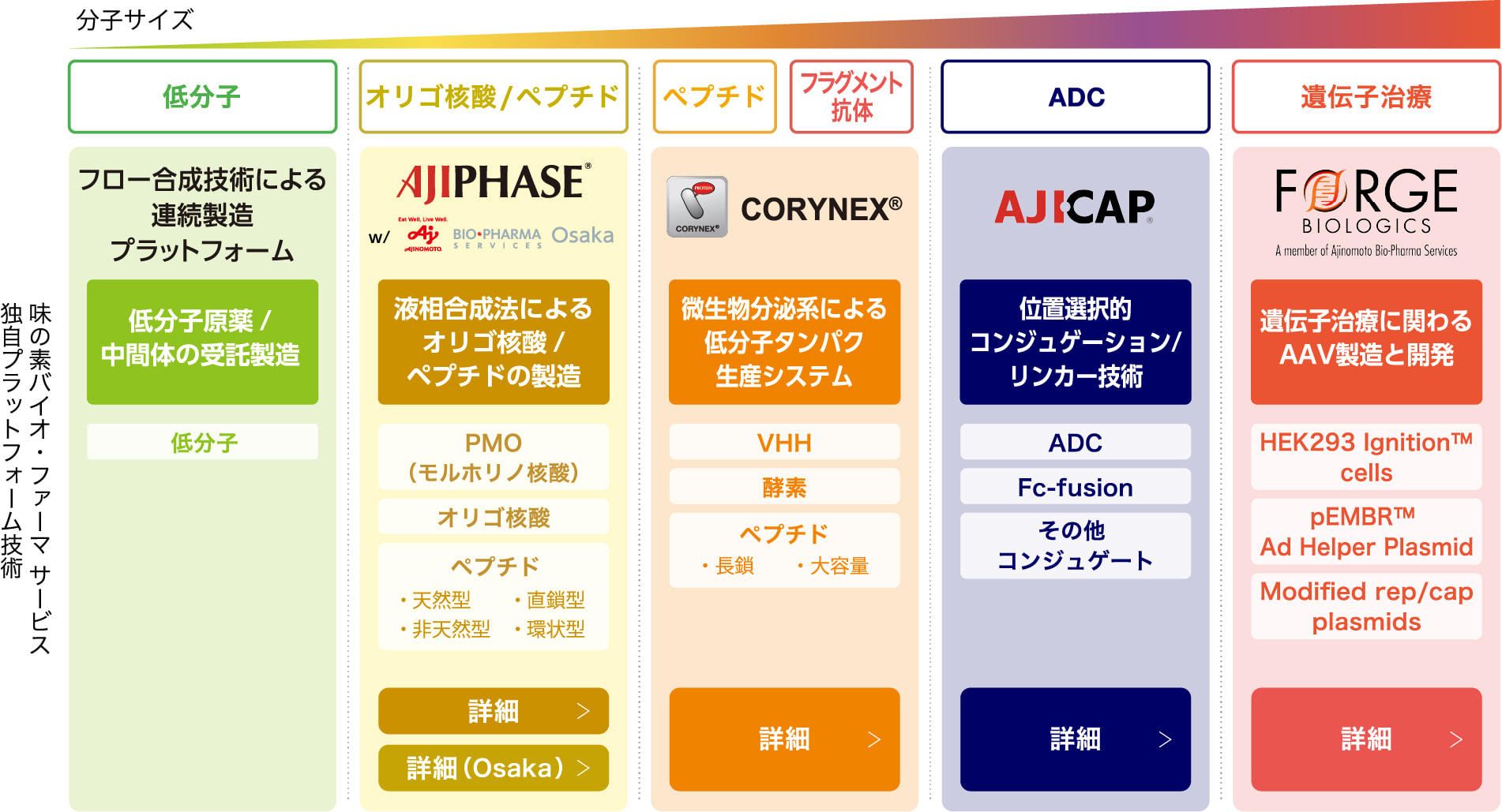 Ajinomoto Bio-Pharma Servicesは、広範なモダリティに対し、独自のプラットフォーム技術を用いたサービスを提供し、前臨床から商業製造までをサポートしています。