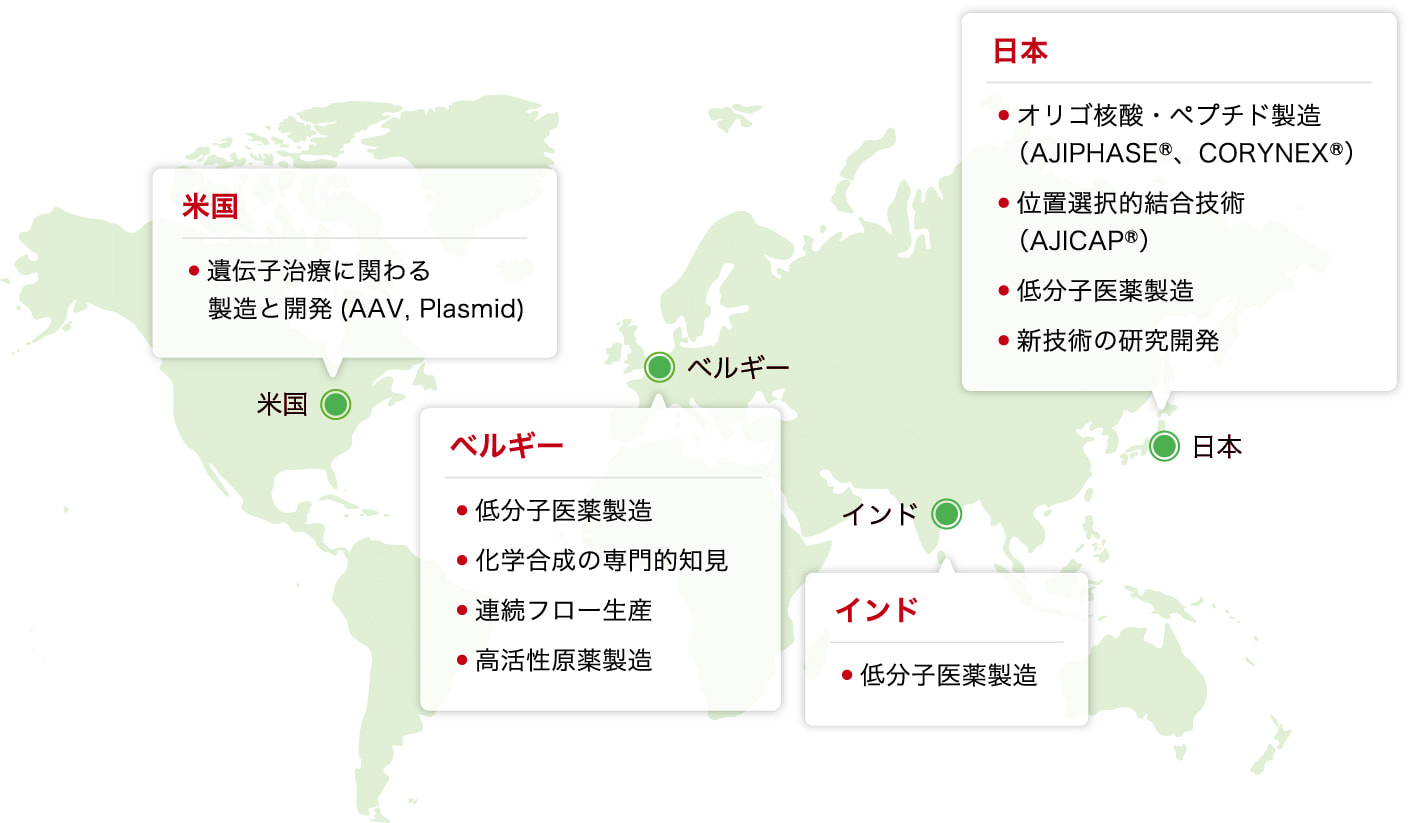 Ajinomoto Bio-Pharma Servicesは低分子、中分子から高分子、そして遺伝子治療に関わる包括的な原薬や中間体の製法開発からGMP製造に至るまで、ベルギー、米国、日本、インドを拠点に、一貫したサービスを提供するグローバルなCDMO(受託開発・製造受託機関) です。